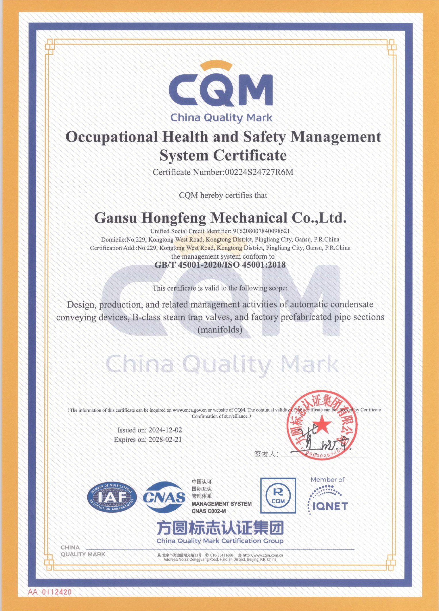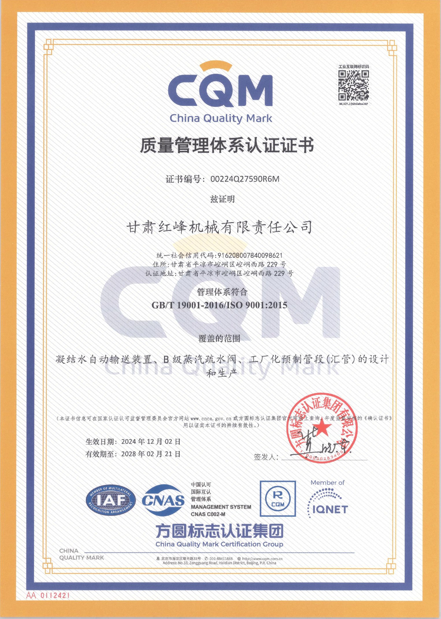 質量管理體系認證證書