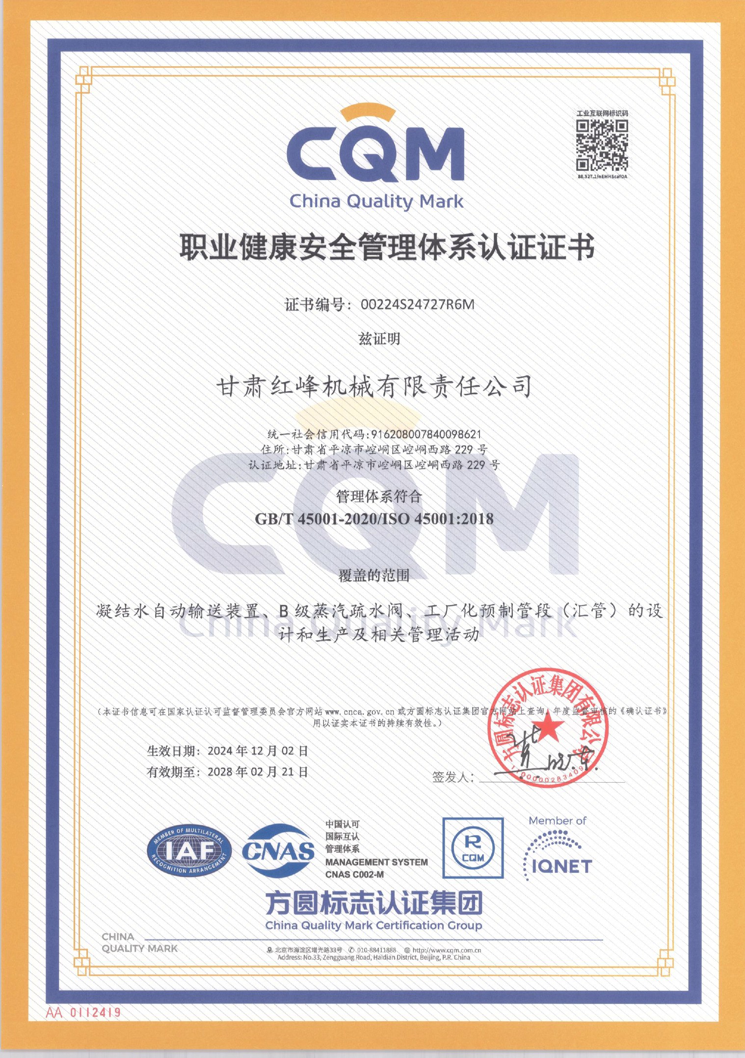 職業健康安全管理體系認證證書