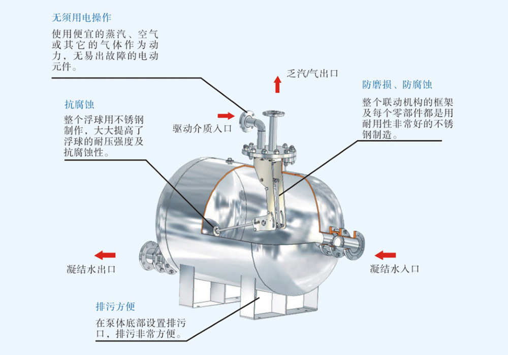 汽/氣動力機械泵凝結水回收裝置是一種維護工作少、無須用電操作,使用蒸汽、空氣或其它不燃無毒氣體作為驅動介質的水資源回收設備,可將凝結水或其它液體從較低位置送往較高位置,或從較低壓力或真空送至較高壓力;可用于閉式循環系統,無蒸汽或閃蒸汽損失,從而把高價值的熱量回收并返回到系統中;還可放置在水淹坑中,無觸電或斷路故障隱患。凝結水的回收溫度高達185℃,高于傳統離心泵100℃的上限,且無密封泄漏、無葉輪磨損或馬達等電氣元件故障問題,減少了停車和維修時間。