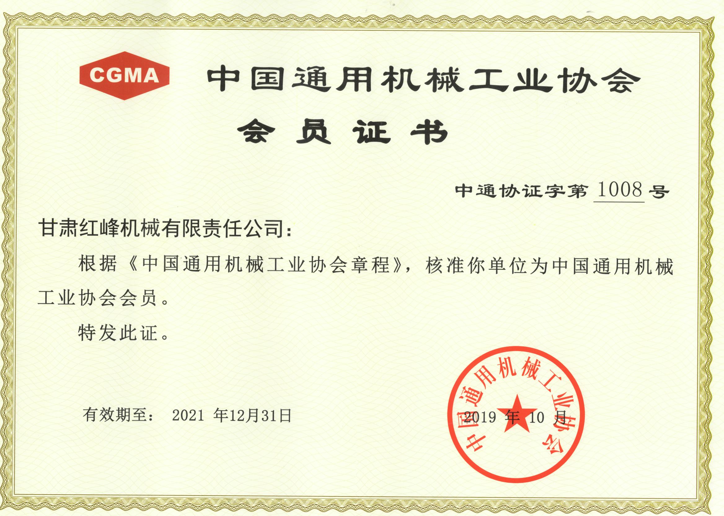 2019年中國通用機械工業協會會員證